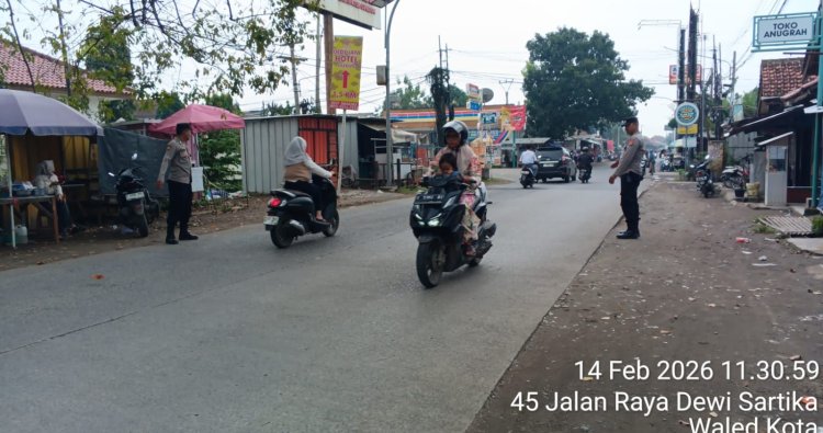 CIREBON — Personel piket SPKT Polsek Waled, jajaran Polresta Cirebon, melaksanakan kegiatan Police Hazard (PH) siang berupa pengaturan lalu lintas sekaligus membantu penyeberangan warga di jalan raya Waled–Kuningan, Sabtu (14/2/2026).